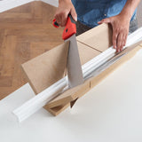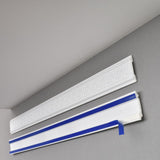 Before fixing the decorative moulding strip, the corners should already be cut using the mitre box and fine tooth saw. Peel away circa 5 cm of the blue protective film from the end of the length, fold out away from the moulding to allow the coving strip to be placed on the wall and carefully moved into position. Now the full length of blue protective film can be carefully removed while making any final adjustments to the positioning of the moulding on the wall. Finally, press the moulding strip firmly onto the wall for circa 5 seconds to ensure complete contact is made.