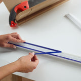 Before fixing the decorative moulding strip, the corners should already be cut using the mitre box and fine tooth saw. Peel away circa 5 cm of the blue protective film from the end of the length, fold out away from the moulding to allow the coving strip to be placed on the wall and carefully moved into position. Now the full length of blue protective film can be carefully removed while making any final adjustments to the positioning of the moulding on the wall. Finally, press the moulding strip firmly onto the wall for circa 5 seconds to ensure complete contact is made.