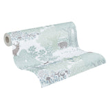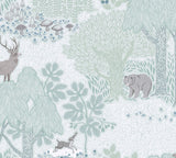 Transform your child's room into a whimsical forest wonderland with this wallpaper. Featuring a charming, hand-drawn design of deer, foxes, bears, and bunnies nestled among soft green trees and delicate foliage, this wallpaper brings the calm and curiosity of nature right into your little one’s space.